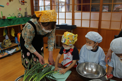 梅・藤・桜組は、一緒に豚汁の材料を切って料理会をしました