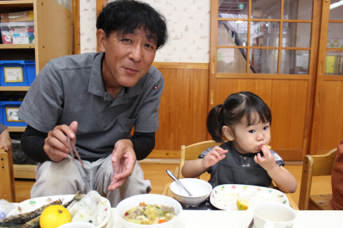 そして、みんなでホールに集まって園長先生が炭で焼いてくれた秋刀魚と豚汁とおむすびとみかん🍊を食べましたよ