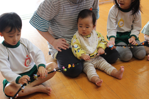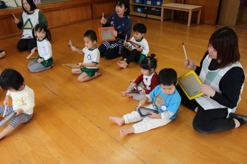 宮崎先生の叩いたリズムをまねっこして鳴らしたり、「やきいもグーチーパー」の曲でじゃんけんをしましたよ。