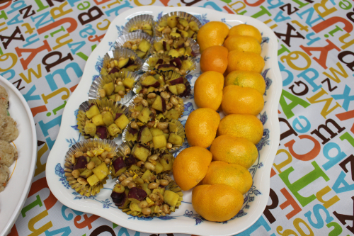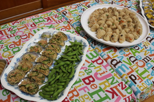 ・中華おこわ・ミニおでん・きのこグラタン・切干ナムル・ゆでまめ・くだもの(オレンジ)・さつまいもと大豆のコロコロソテー