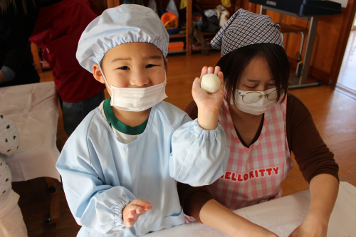 みんなでお餅を丸めていろいろな大きさのお餅が出来上がりました