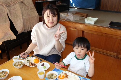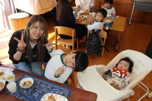 きな粉・磯部餅・ずんだ餅・あんこ餅の4種類と冬野菜のあったか汁・鶏肉の幽庵焼き・みかんをみんなで一緒に食べました