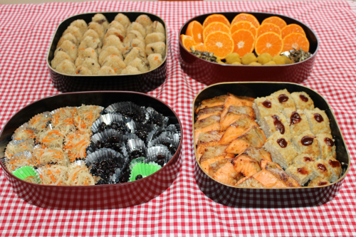 ・炊き込みご飯・ミートローフ・鮭の西京焼き・黒豆煮・きんとん・田作り・紅白なます・みかん🍊