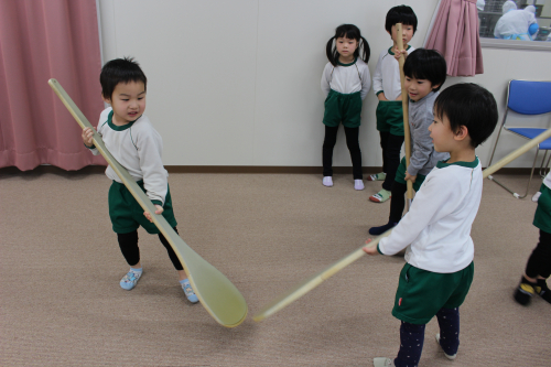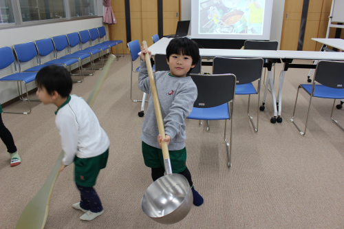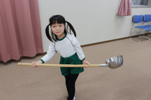 給食センターのおたまとしゃもじを触らせてもらいました。みんなの背の高さと同じくらいあって重たかったようです。