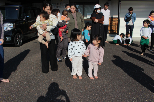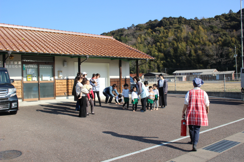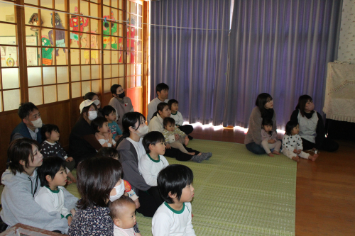 朝の歌を歌っている時に火災が起きたと想定していつもの避難訓練を見てもらいました。
