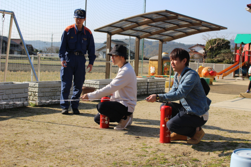 そして、保護者の方には消火訓練をしてもらいました