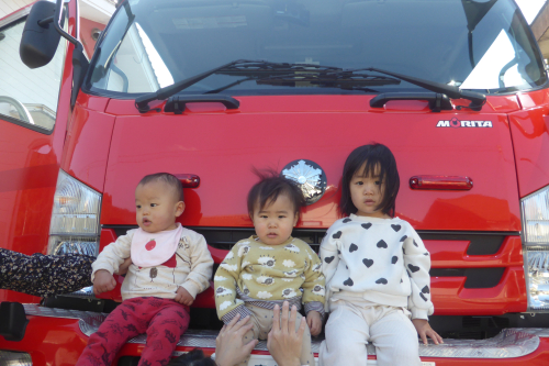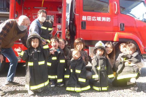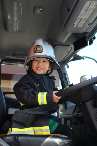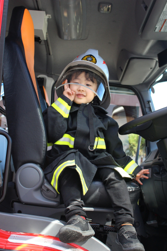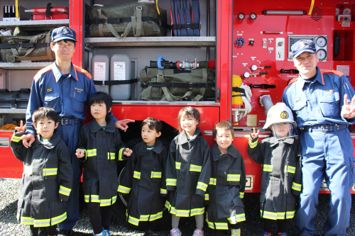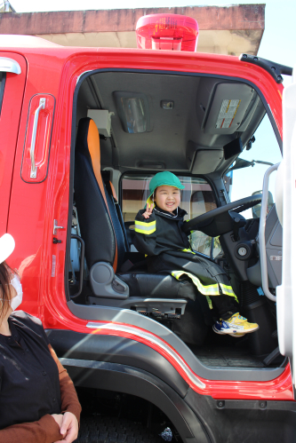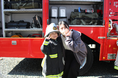 その後は、消防車の見学をさせてもらったり梅藤桜組は消防服を着せてもらいました。