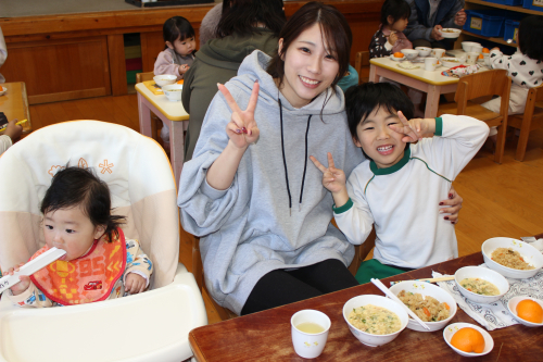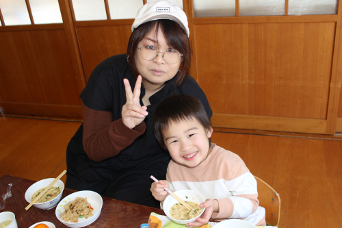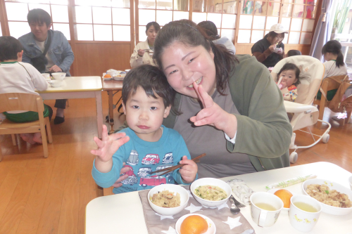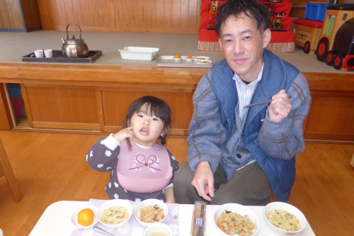 お昼は、お父さん・お母さんと給食を食べましたよ