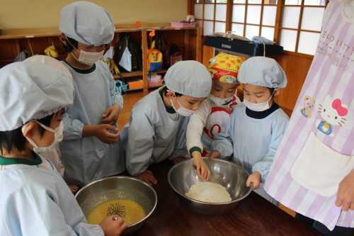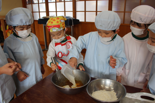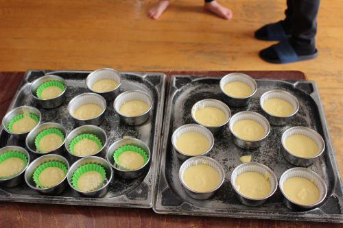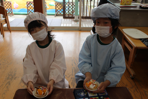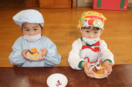 給食室のオーブンで焼いてもらってふっくらカップケーキの完成~