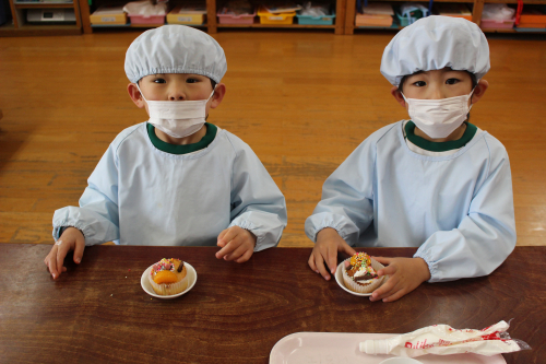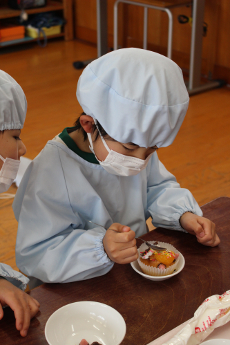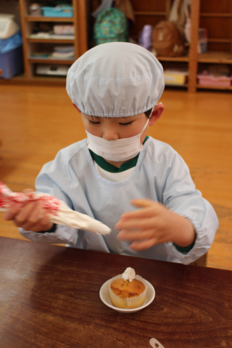 自分たちのカップケーキに生クリームやチョコレート・みかん🍊で飾り付けをしていったよ