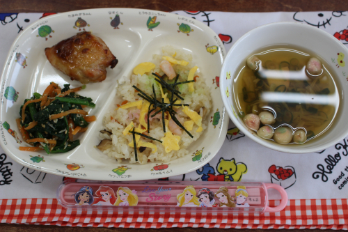 給食もひなまつりメニューのちらし寿司・鶏肉のくわ焼き・ほいれんそうのごま和え・すまし汁でした😊